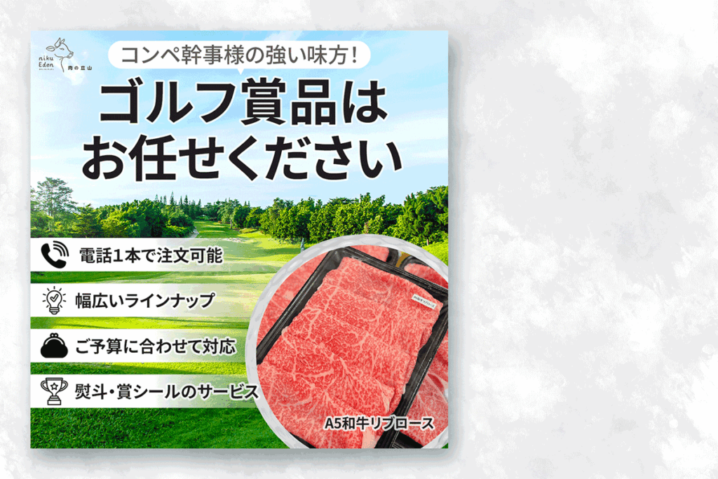 ゴルフ賞品サービスの認知拡大バナー 2026年1月22日 最終更新日時 : 2026年1月22日 top-gun-ichida 「幹事様の味方」というキーワードで親近感と信頼感を訴求。 グリーンの背景と高級食材のビジュアルを対比させ、“爽やか×豪華”な印象に。 視線誘導を意識し、実際の商品画像を使用することで、リアルな魅力を演出しました。