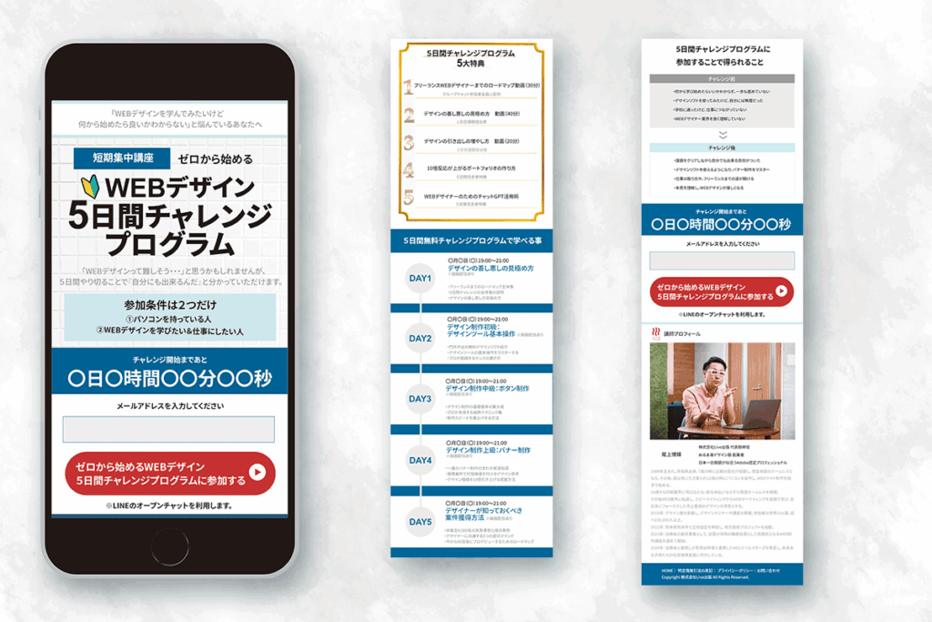 WEBデザイン5日間チャレンジLP 2026年1月22日 最終更新日時 : 2026年1月22日 top-gun-ichida 未経験者の不安を“挑戦意欲”に変えるLPデザイン。 信頼感をベースに、5日間の学習ストーリーをタイムライン形式で訴求。